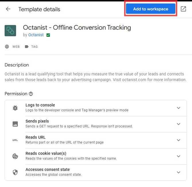 - Create a new tag: Octanist - Offline Conversion Tracking. After successfully importing the template, the Octanist Tag should appear under the Custom Tab.