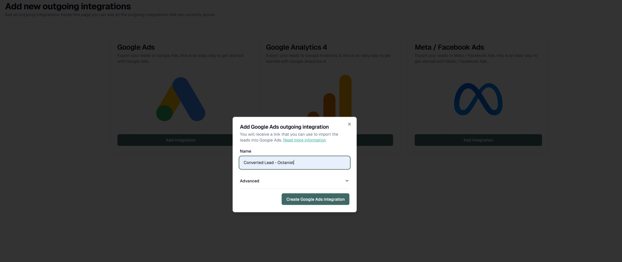 - Give the integration a clear and concise name, such as: Company Name - Octanist - Google Ads Integration.