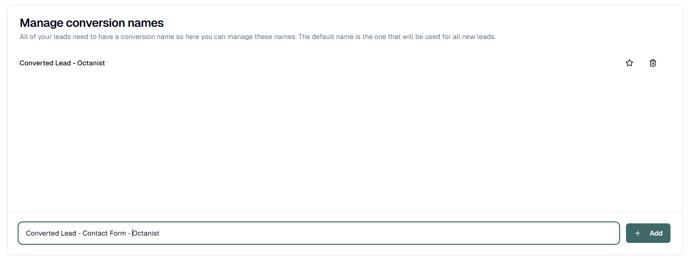 - Under Manage Conversion Names, add clear and concise conversion names. For example: Converted Lead - Octanist.