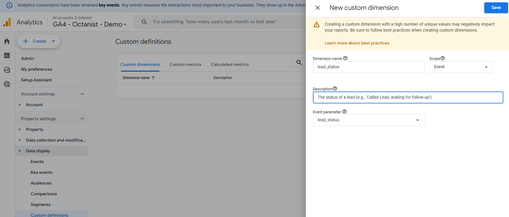 ; you can name this as you prefer). - Description: A description of the custom dimension (e.g., “The status of a lead (e.g., ‘Called Lead, waiting for follow-up’).”).